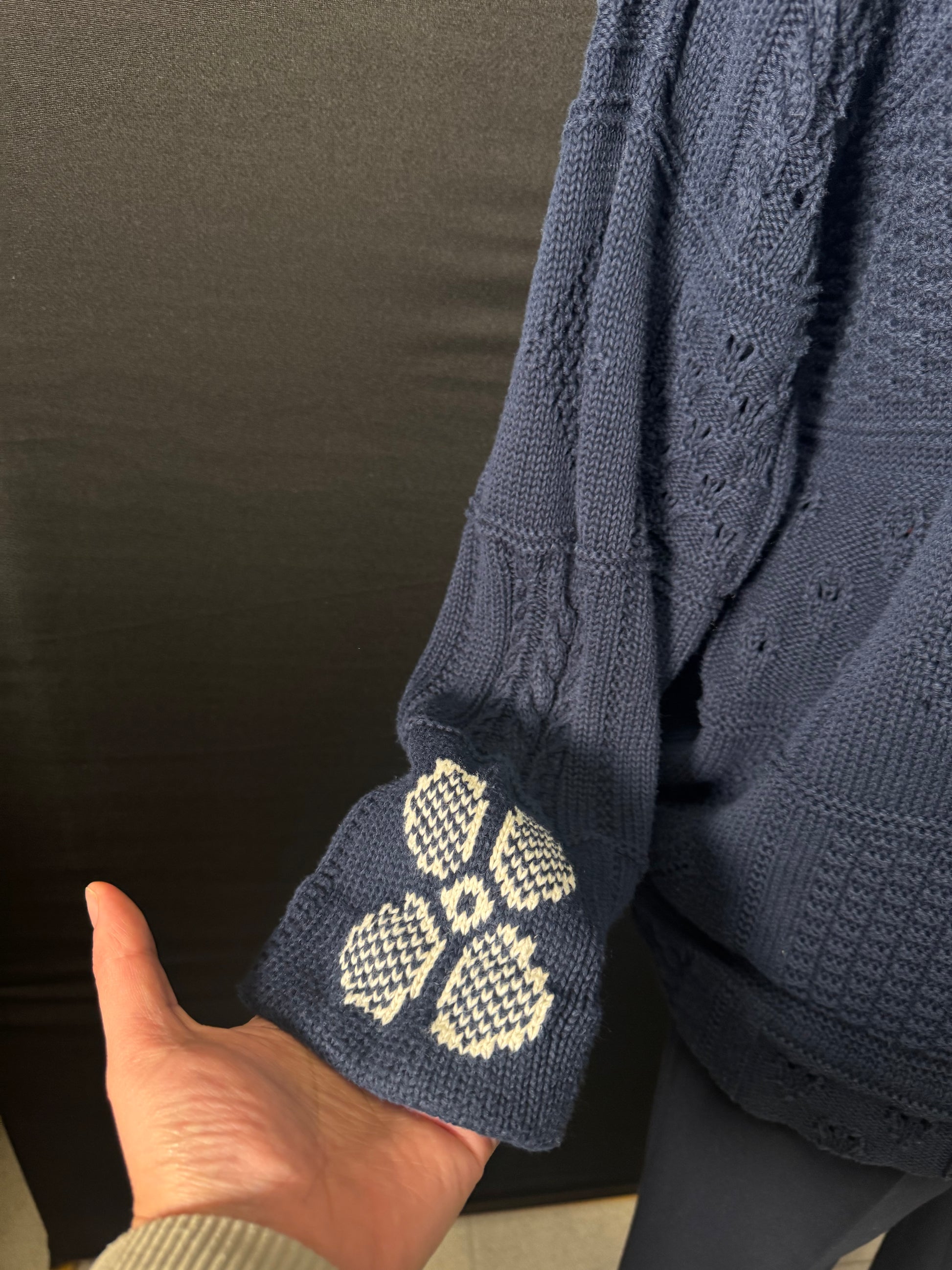Der Baumwollpullover in Marineblau mit weißen Blumendetails kombiniert Komfort und Stil. Hergestellt aus hochwertiger Baumwolle, bietet er Atmungsaktivität und eine optimale Passform. Ideal für verschiedene Anlässe, sorgt er für ein elegantes Erscheinungsbild und eine angenehme Trageerfahrung.