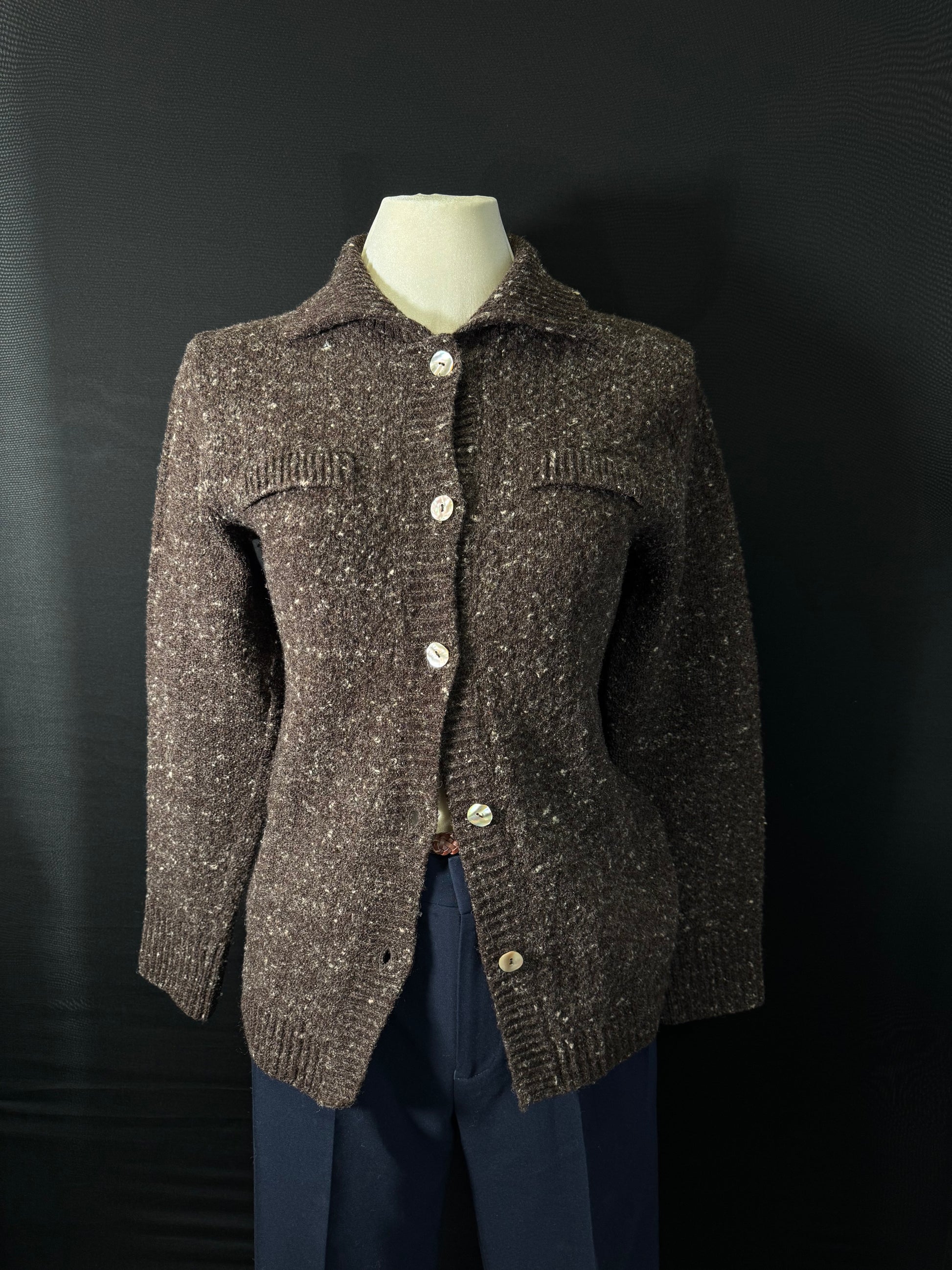 Entdecken Sie die braune Strick-Langarmweste, die mit eleganten Perlmuttknöpfen veredelt ist. Dieses zeitlose Kleidungsstück kombiniert Stil und Komfort, perfekt für jede Gelegenheit. Lassen Sie sich von der warmen Textur und dem ansprechenden Look begeistern – ein Must-Have für Ihre Garderobe!