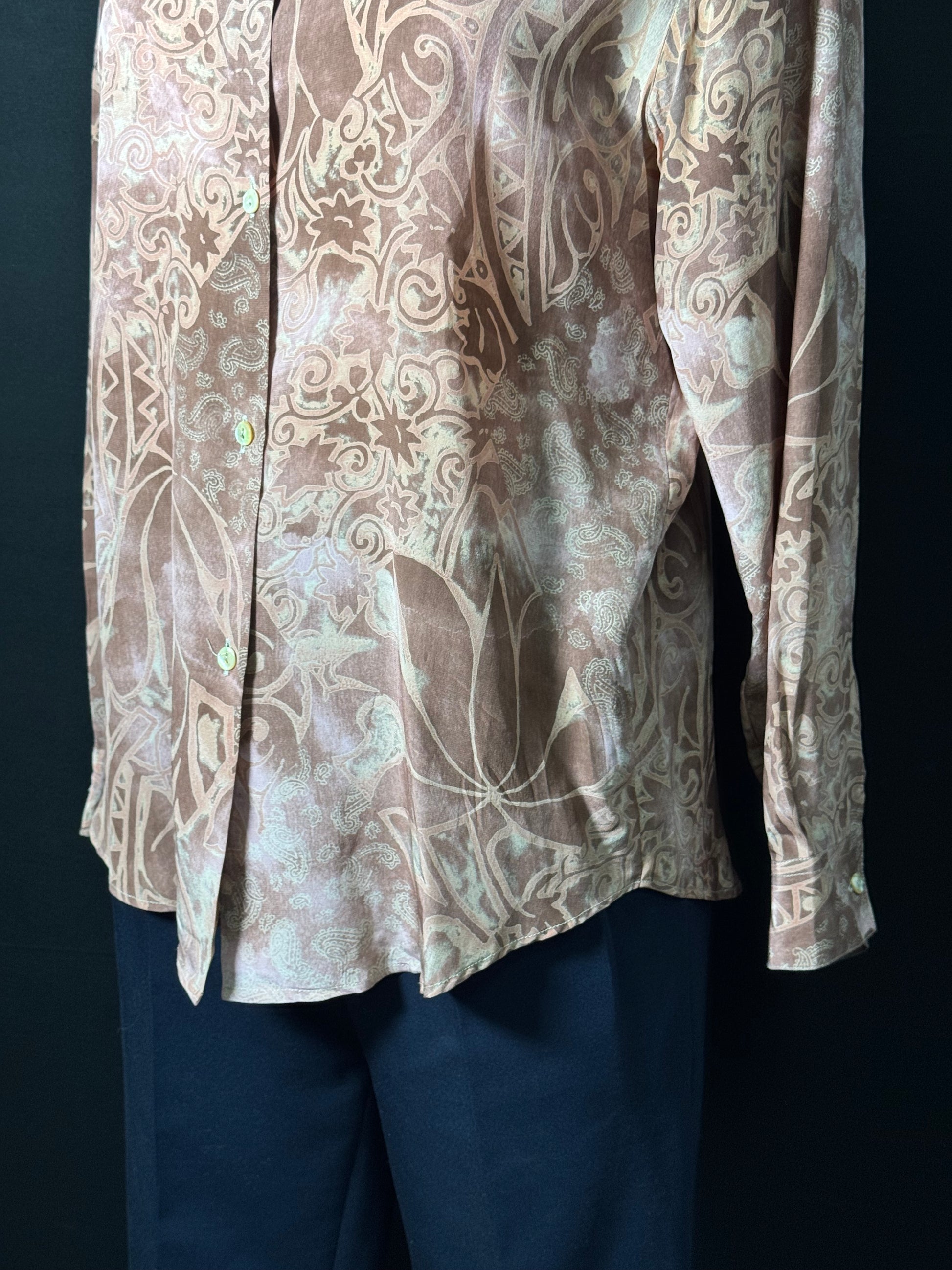 Entdecken Sie die bezaubernde Seidenbluse in Braun mit orientalischem Muster, die perfekt für Größe S/M geeignet ist. Ihr elegantes Design strahlt Anmut aus und verleiht jedem Outfit einen Hauch von Exotik! Lassen Sie sich von der edlen Textur verführen und erleben Sie unvergessliche Momente im Stil!
