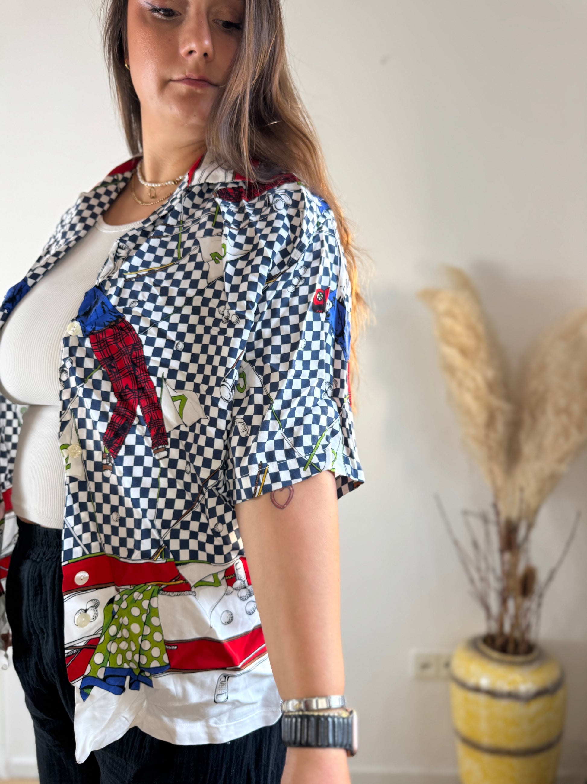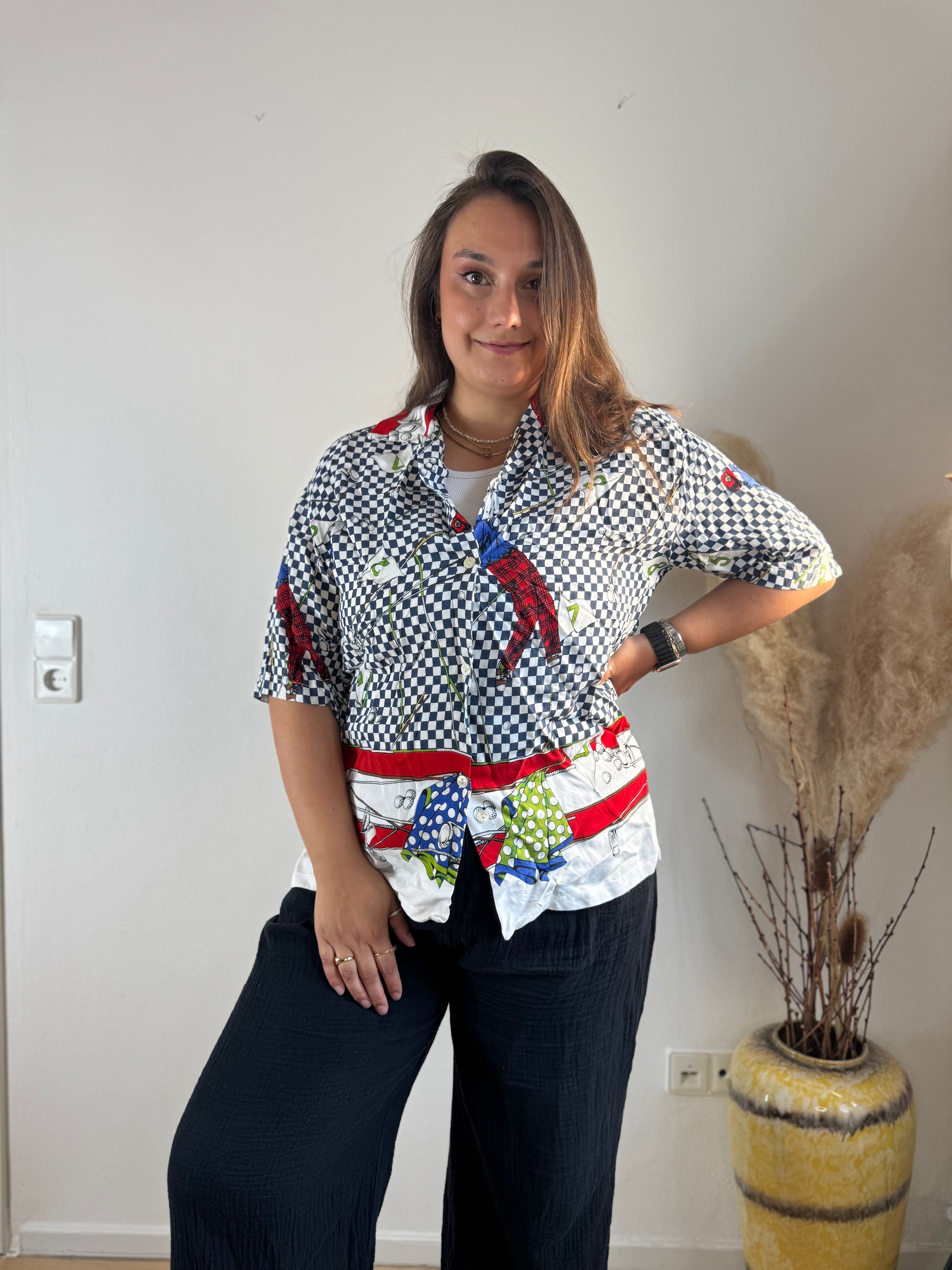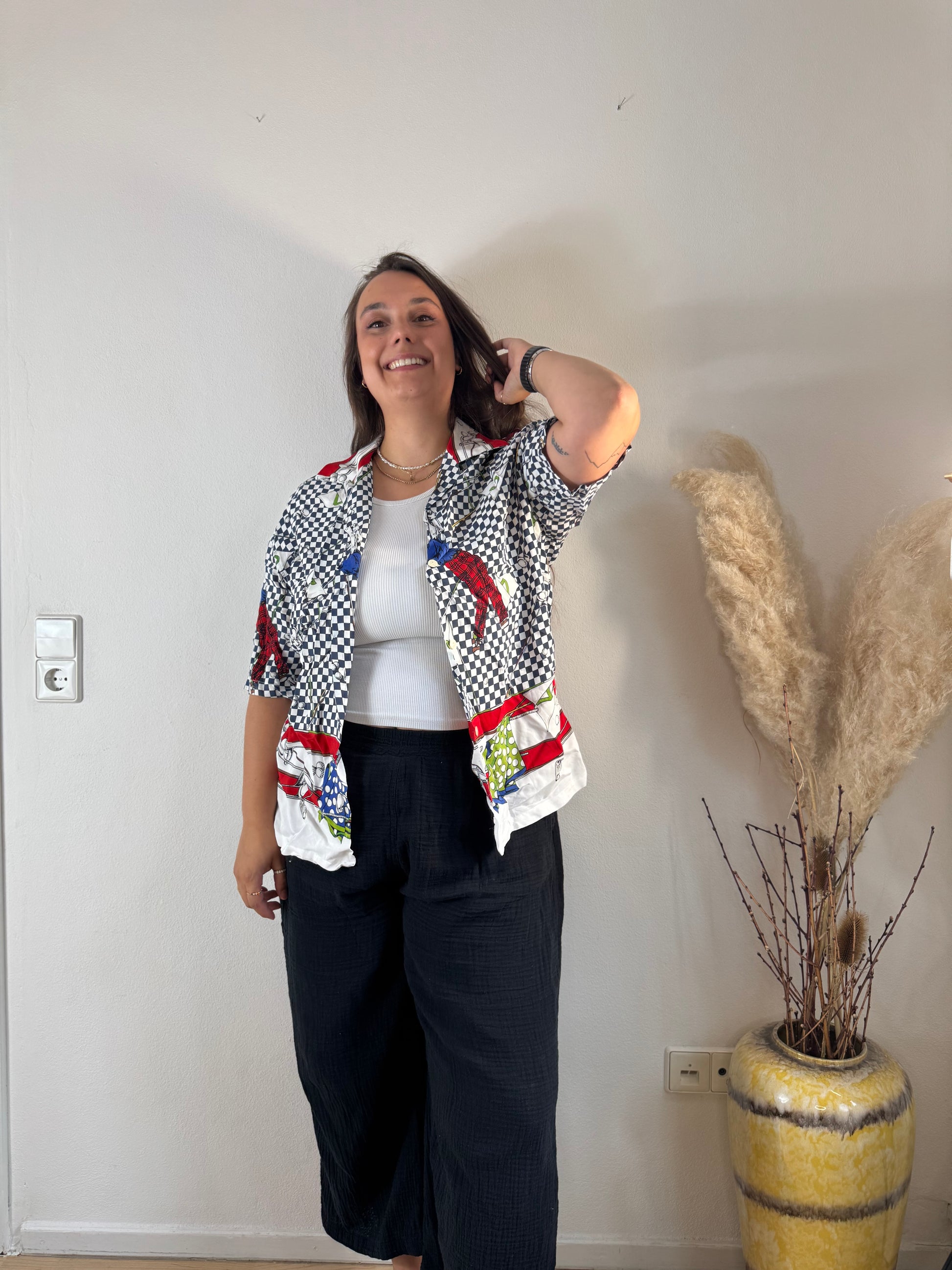 Setze ein Fashion-Statement mit dieser farbenfrohen Kurzarmbluse! Der auffällige Mix aus Karo-, Chili- und Fliegenpilz-Print verleiht deinem Look eine verspielte und zugleich stylische Note. Der lockere Schnitt sorgt für ein angenehmes Tragegefühl – perfekt für warme Tage oder als Eyecatcher unter einer Jacke.